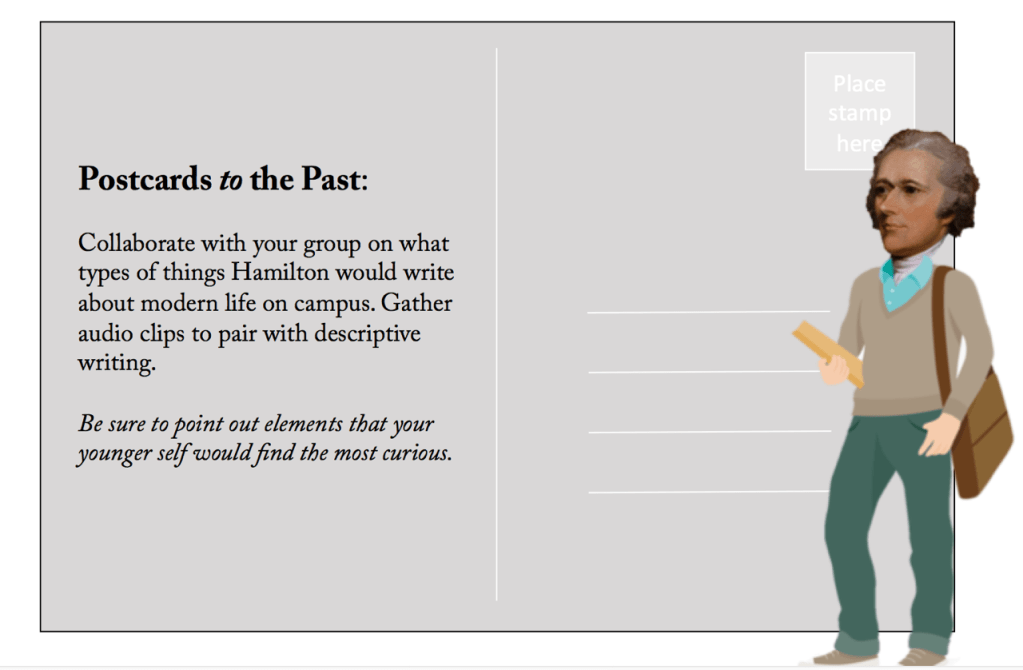 Now it’s time for someone else to take in today’s Hamilton College campus – Alexander Hamilton himself! As a group, share your audio recordings and tell why you chose what to capture. How would these elements of modern-day college seem to someone from the founding of our country?